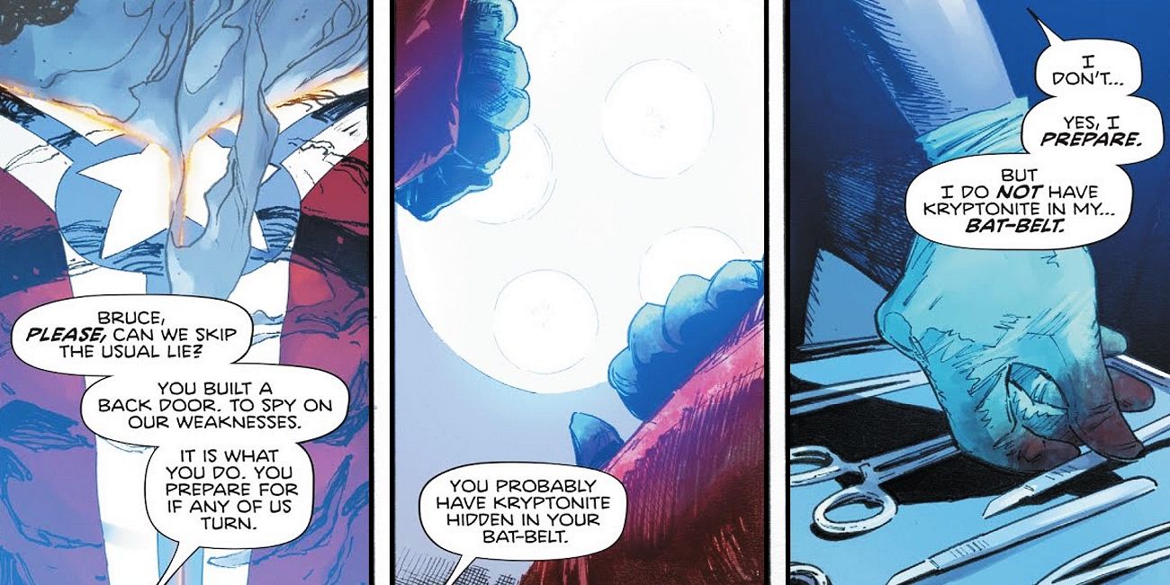 Harley ties the rope around Batman's neck and forces the caped crusader to divulge the best way for her to escape their confrontation. And as Superman and Wonder Woman dismiss her suggestion, the telltale green glow confirms Batman was keeping Kryptonite in his belt, allowing Harley to escape justice. The implication of the moment is clear: If Batman lied about having Kryptonite, then it's just as possible that he also lied about storing the Sanctuary confessions. Batman probably isn't responsible for the deaths at Sanctuary... but he may be the one to blame for their secrets getting out. To further underline this point, the action shifts to Metropolis, as Lois Lane receives word that confessions have already started to leak - beginning with Arsenal discussing his drug addiction.