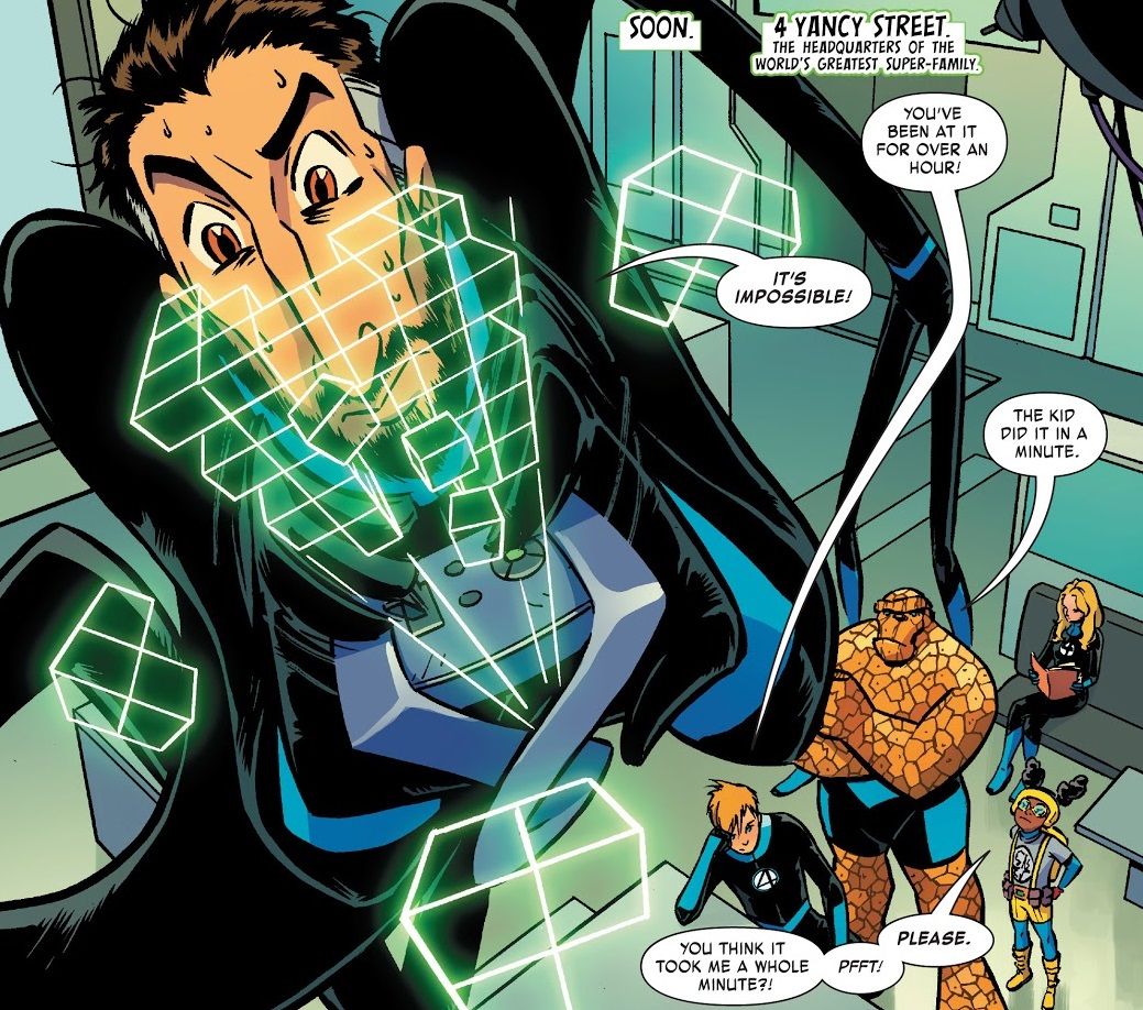 Reed has never been known to back down from a challenge (or face an embarrassing failure) and this time it is no different. He accepts, and is instantly shown sweating bullets as he tries to figure out the 'Banner B.O.X.' or 'Brain Omnicompetence Examiner.' The B.O.X. was designed by Hulk's brilliant half, Bruce Banner to measure the world's super-intellects. Reed can't seem to figure it out... after Lunella took less than a minute to complete it.