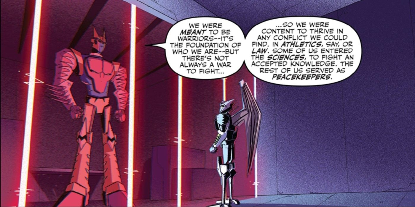 Predacons, he reveals, are meant to be warriors, but in the event of peace, they have been content in finding and immersing themselves in other forms of conflict that don't necessarily have to be violent. For example, many Predacons have become scientists to battle groupthink. Others have even found a calling as peacekeepers. Although not explained in full, it can be assumed that peacekeepers keep the peace through force when necessary. It is because Predacons seek conflict that Dinobot agreed to join Megatron in the first place. The Predacon leader sought to take the Golden Disks from the Maximals by force, and since the Maximals had been hiding their significance from the general public, Dinobot felt that this was a conflict that needed to be rectified. It was only when Megatron and his followers began enacting and carrying out overly cruel policies that Dinobot began to doubt his leader's intentions. Megatron resorting to torture was the last straw.
