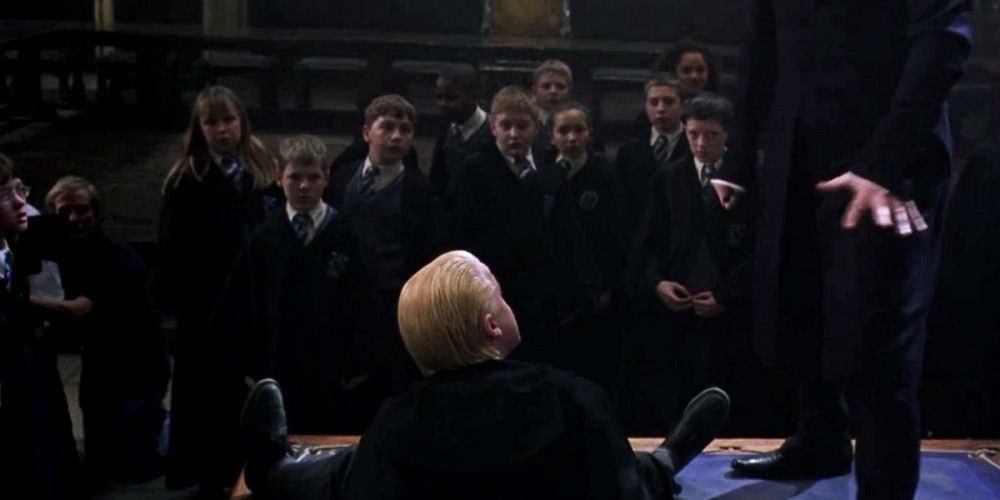 During the dueling scene between Harry Potter and Draco Malfoy in Chamber of Secrets, the two boys try out a bunch of spells to beat each other. Among all this furor you’d be bound to miss a lot of what was going on around the surroundings, causing you to not have your eye on a mistake right in front.