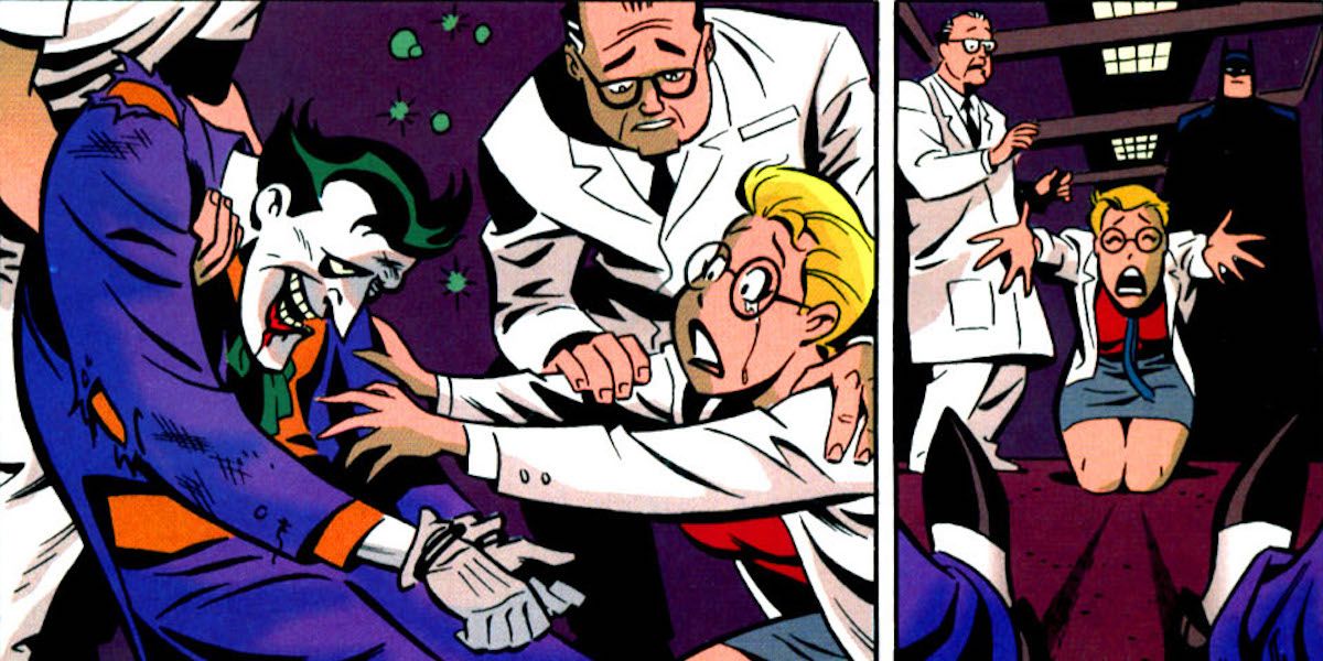 Though her backstory has fluctuated slightly over the last couple decades, the groundwork established in Mad Love is essentially still canon in most adaptations of Harley. Prior to being the Joker’s girlfriend, Dr. Harleen Quinzel was a psychologist spending her internship at Arkham Asylum. Having earned a gymnastics scholarship to Gotham U, Quinzel graduated with top grades from the university’s prestigious psychology department thanks to sleeping with her professor. Though she “could’ve written her ticket anywhere,” Harleen picked Arkham to intern at because of its high-profile patients/inmates—her motive being to write a tell-all book according to a coworker.