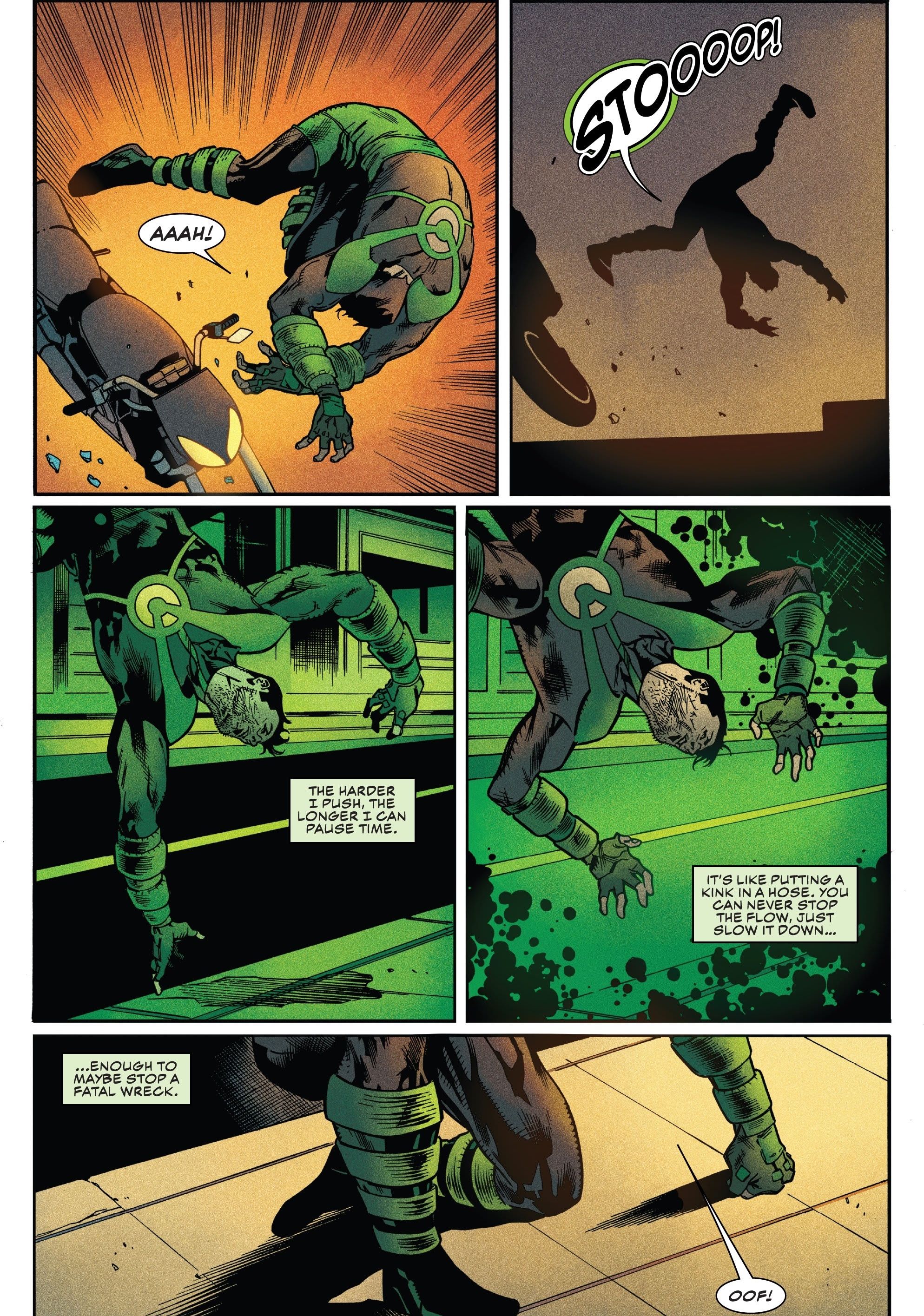 However, Overtime can't do what he needs to if he's put behind bars again, so he does everything he can in his power to evade Captain America and Black Widow, including a high-speed motorcycle chase. However, when Black Widow attempts to wreck Overtime's ride and throw him from his bike, Hector uses his powers to slow himself and his momentum down, allowing him to safely land and keep running from the two Avengers. While doing so, he also explains how his manipulation of time works through the Time Stone, and it's pretty interesting: